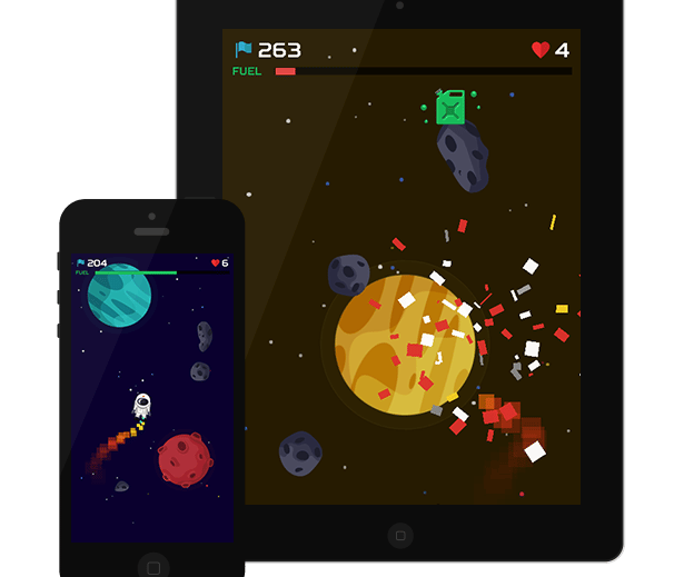 Once your astronaut is launched into the void, he/she continues to move forward; whether you are prepared or not. Like in real life there is no pause button in the void. As you continue to play, you will find yourself making split-second decisions while constantly keeping an eye on the road ahead. Since you are only able to control the vertical aspect of your astronaut’s movements (using your jetpack) you will need to climb higher or fall lower around obstacles that come at you with no warning whatsoever. As you continue to fly the farther you are from the starting point the faster everything moves.